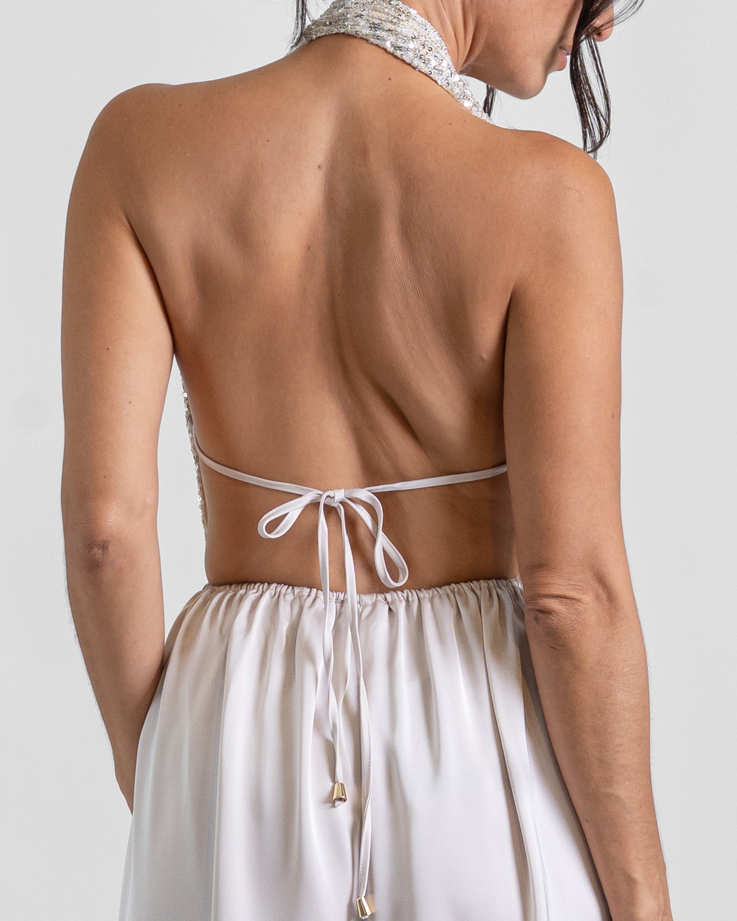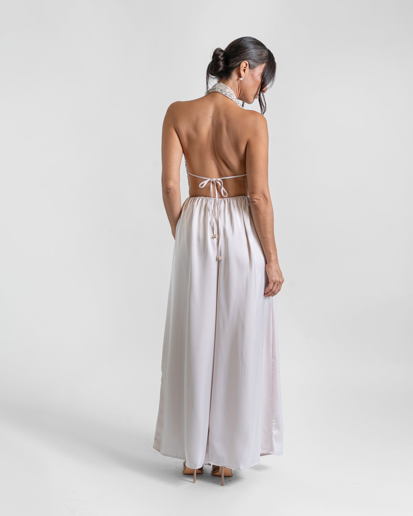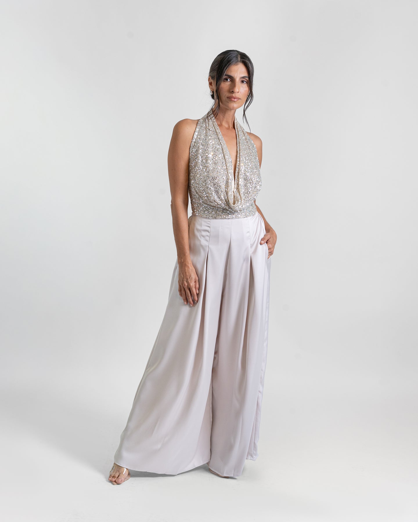 El Lumière Gala es un jumpsuit que combina brillo, elegancia y una silueta fluida que estiliza de manera natural. El top halter drapeado está cubierto de lentejuelas en tono champagne, creando un efecto luminoso que destaca sin ser exagerado. Su espalda descubierta aporta un toque sensual y refinado.