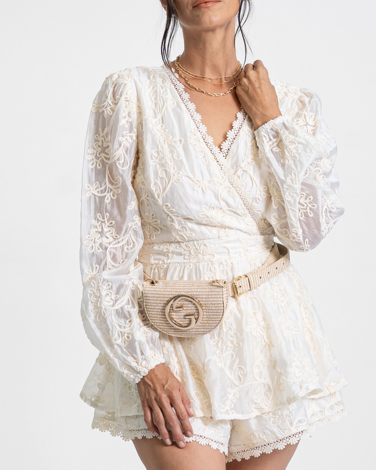 La blusa cruzada define la cintura de manera favorecedora, mientras que las mangas largas translúcidas añaden un toque sofisticado. El short combina vuelo y delicadeza, con un terminado de encaje que complementa el diseño de forma armoniosa.