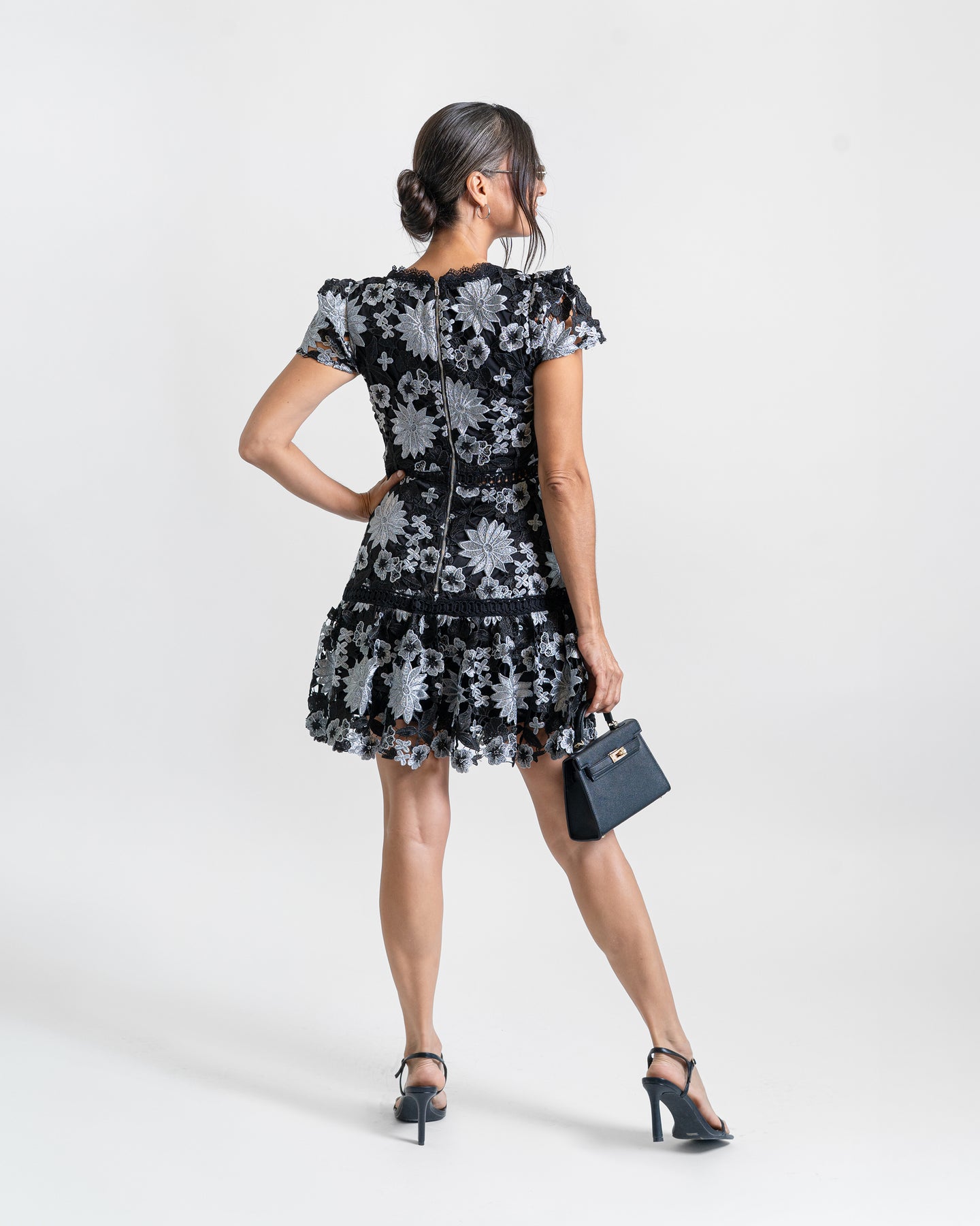 El Noir Bloom es un vestido que combina encaje delicado con flores bordadas en tonos plateados, creando un contraste sofisticado y muy femenino. Su escote en V enmarcado con encaje realza la figura, mientras que la falda con vuelo añade movimiento y un toque coqueto.