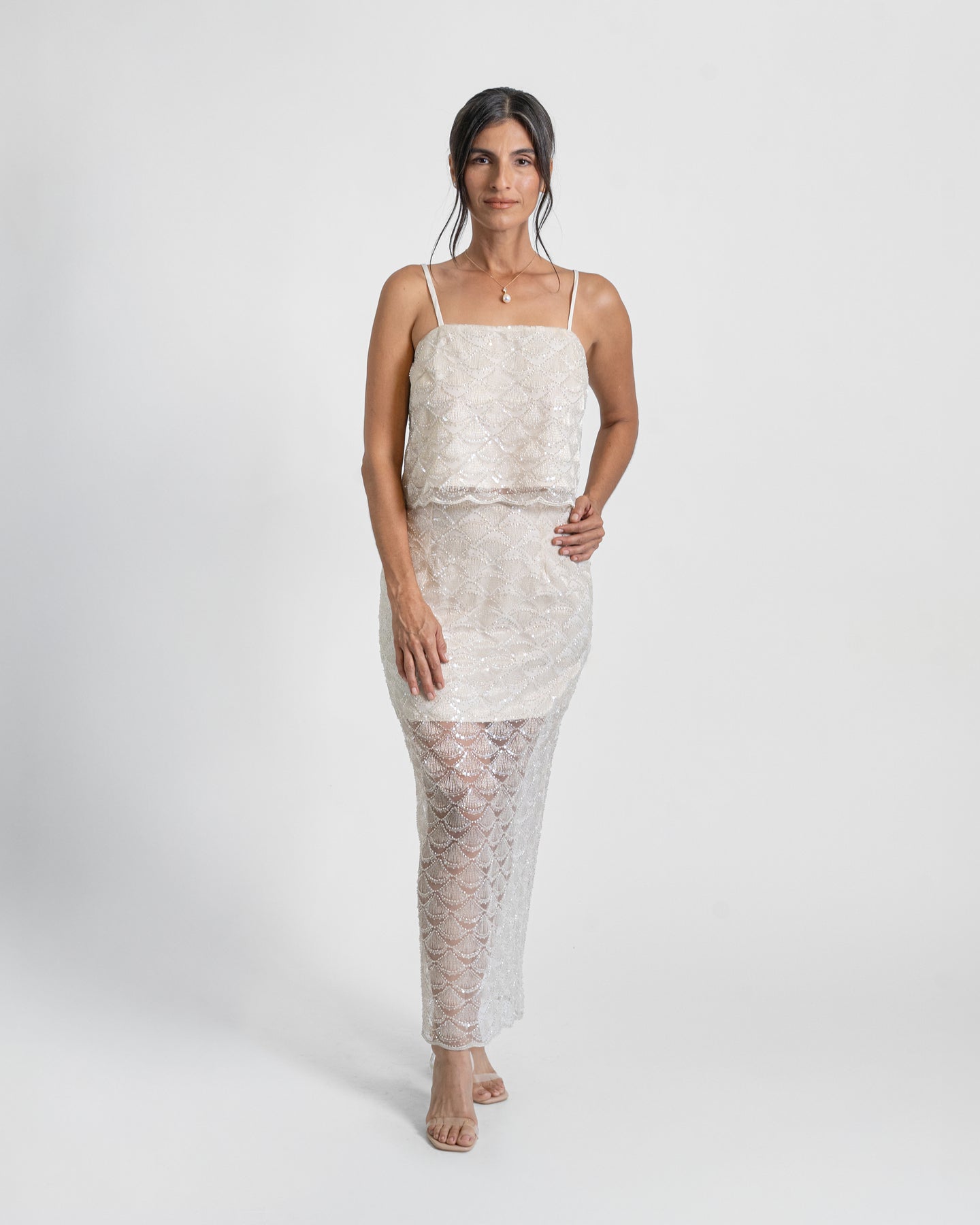 El Ivory Scales es un conjunto diseñado para quienes buscan elegancia con un toque moderno. Su diseño en lentejuelas forma un patrón escamado que refleja la luz de manera delicada, creando un efecto sofisticado y femenino sin caer en el exceso.