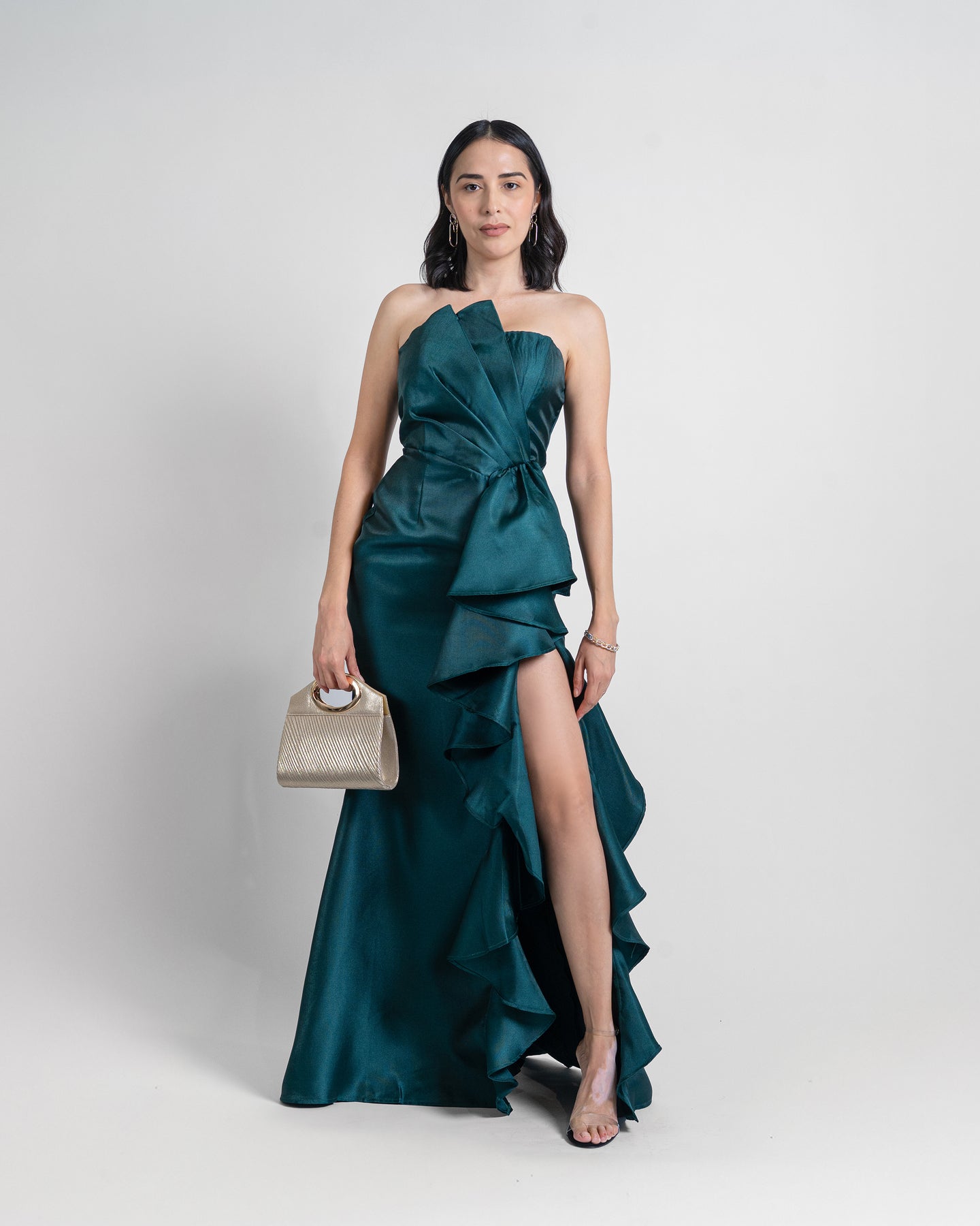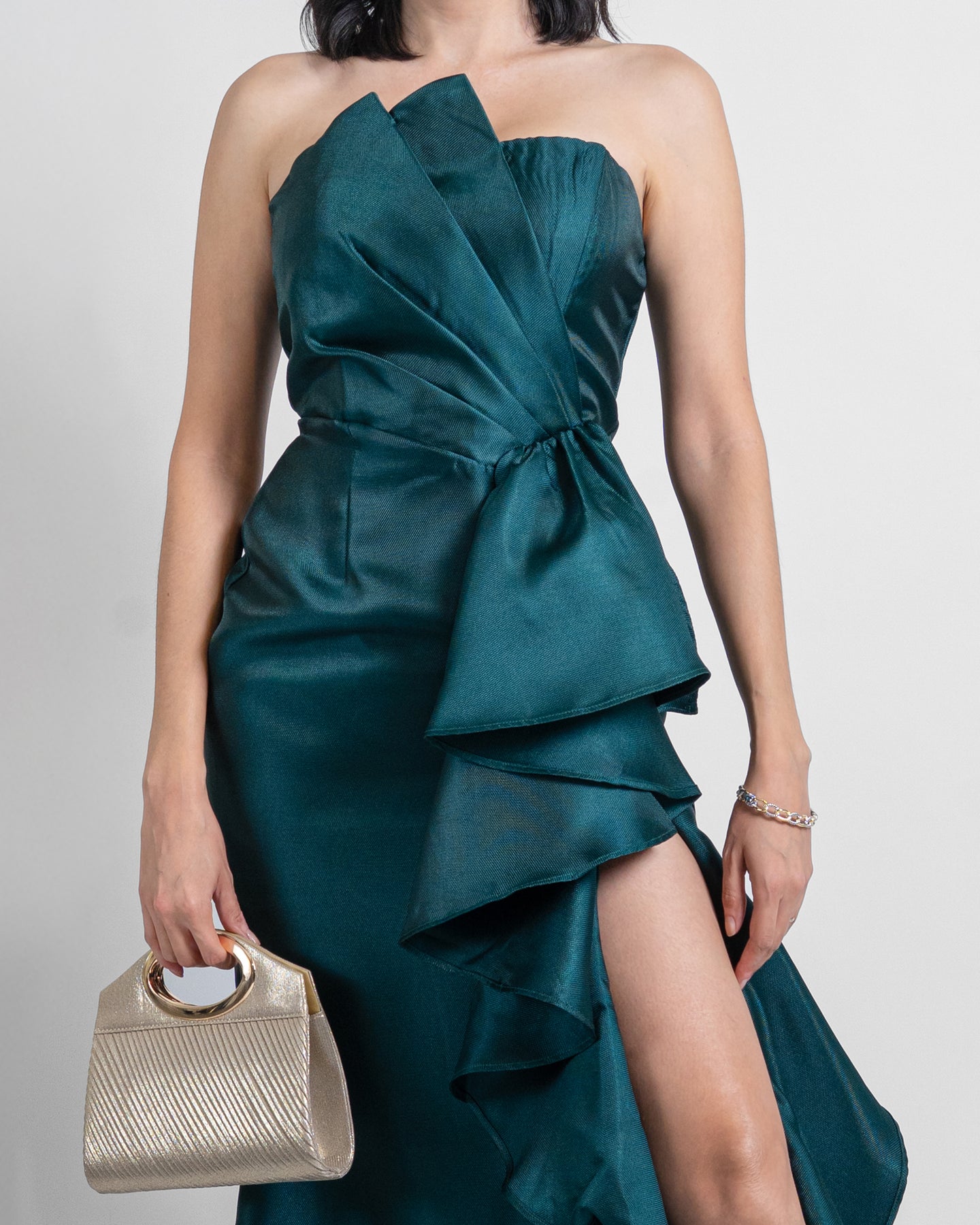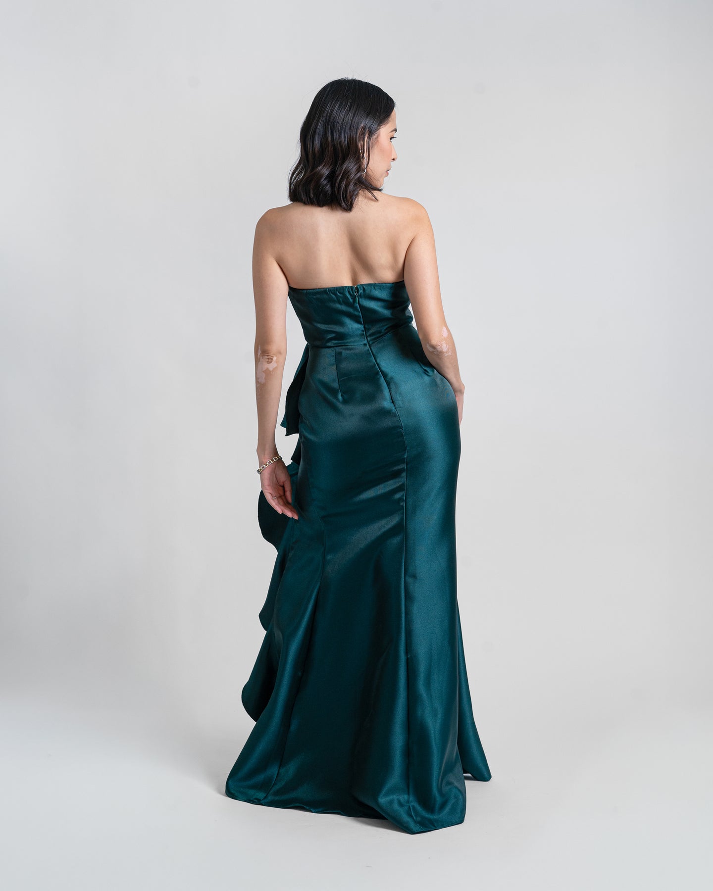 El Emerald Cascade es un vestido que roba miradas desde cualquier ángulo. Su tono verde esmeralda aporta un aire sofisticado y moderno, mientras que el diseño strapless realza los hombros y el escote de manera estilizada.