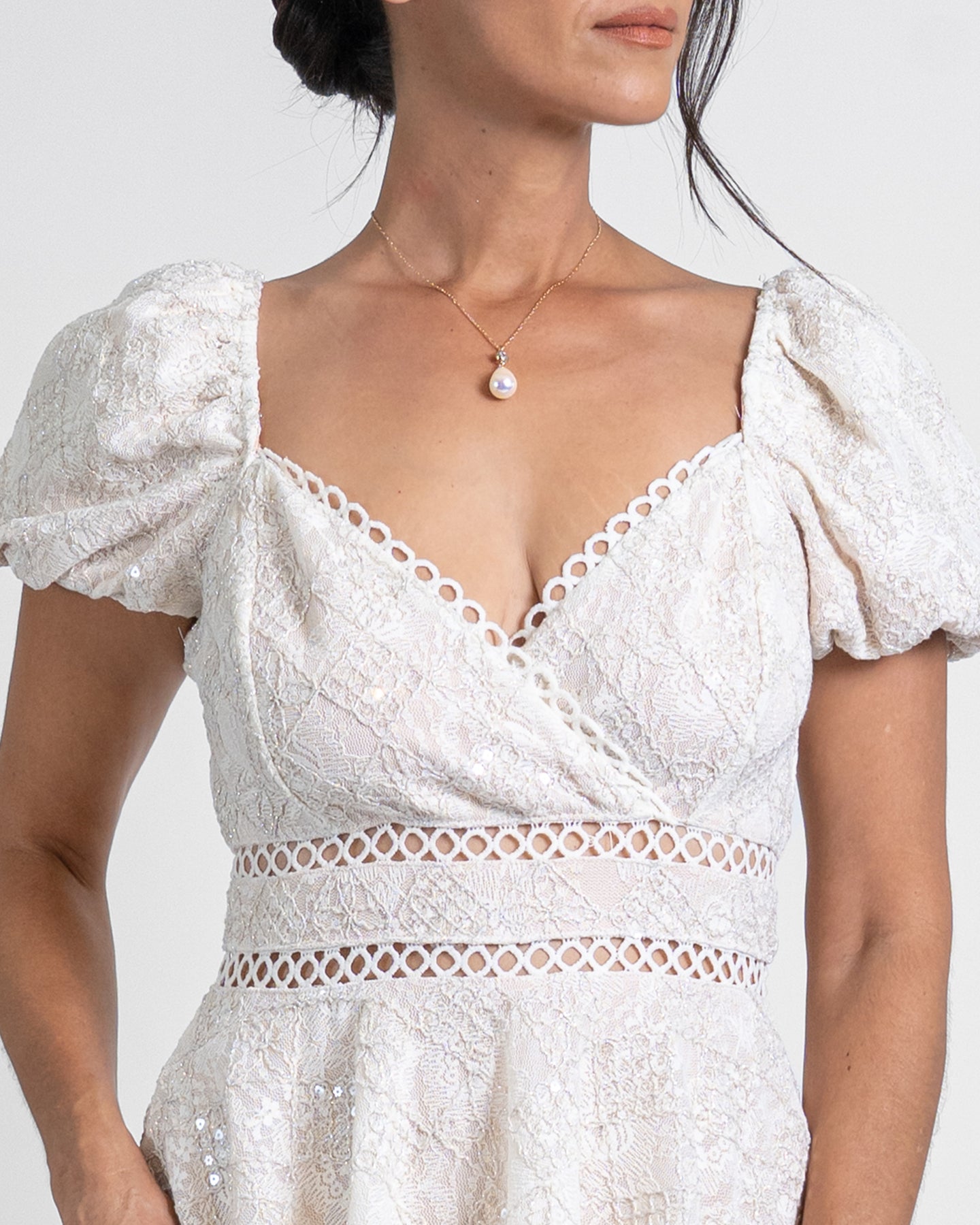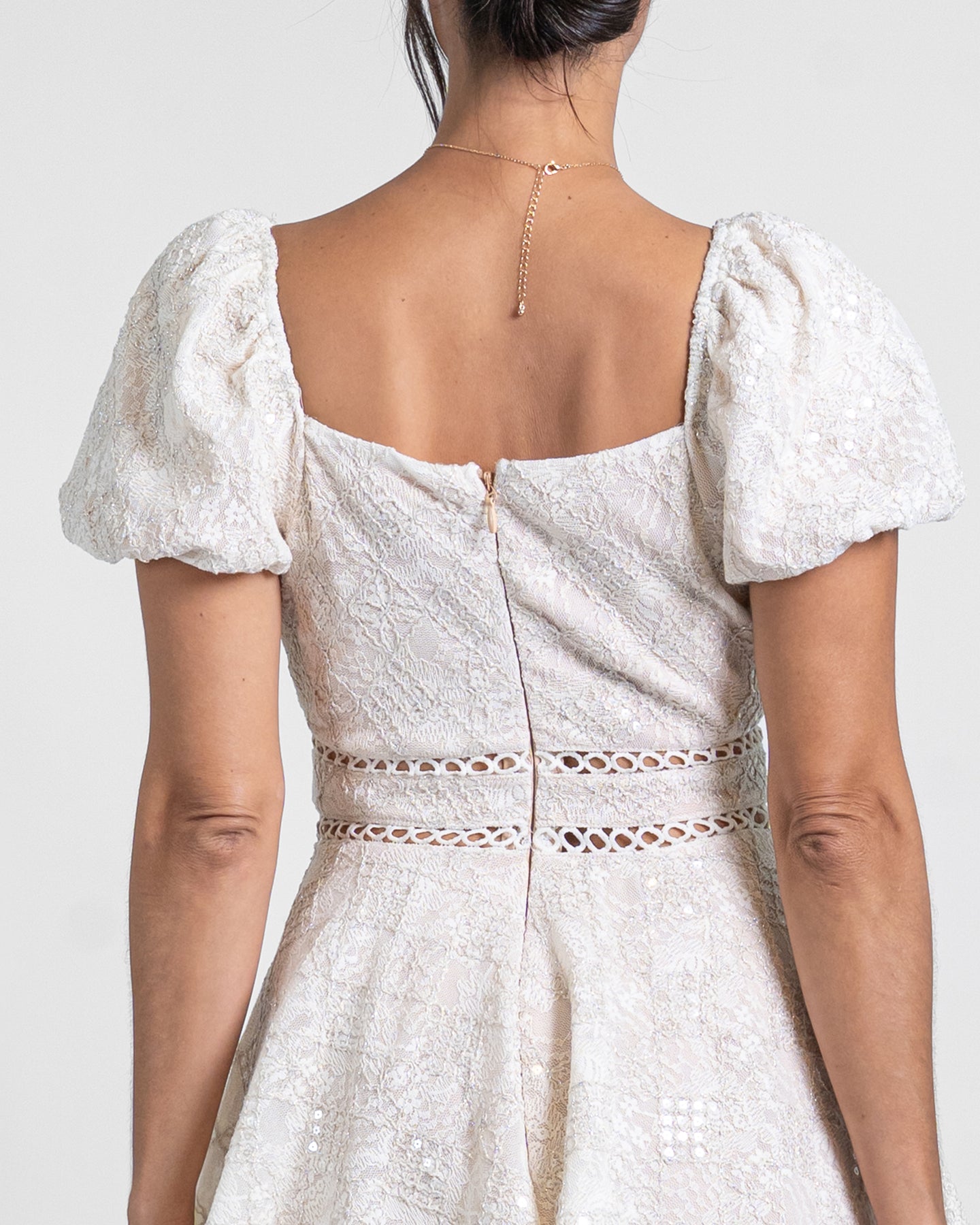 El Ivory Dreams es un vestido midi diseñado para mujeres que buscan un look romántico y elegante sin perder ligereza. Su encaje delicado con destellos sutiles ilumina la silueta de manera natural, mientras que las mangas tipo puff añaden un toque suave y femenino.