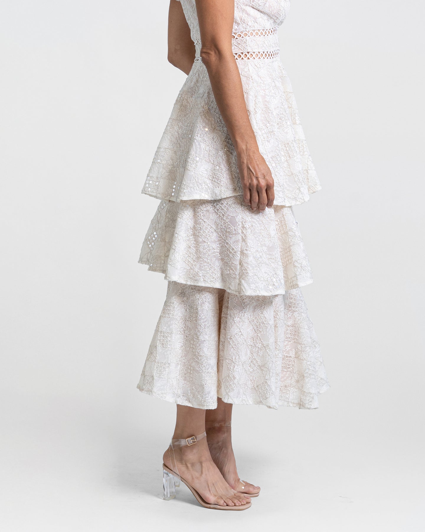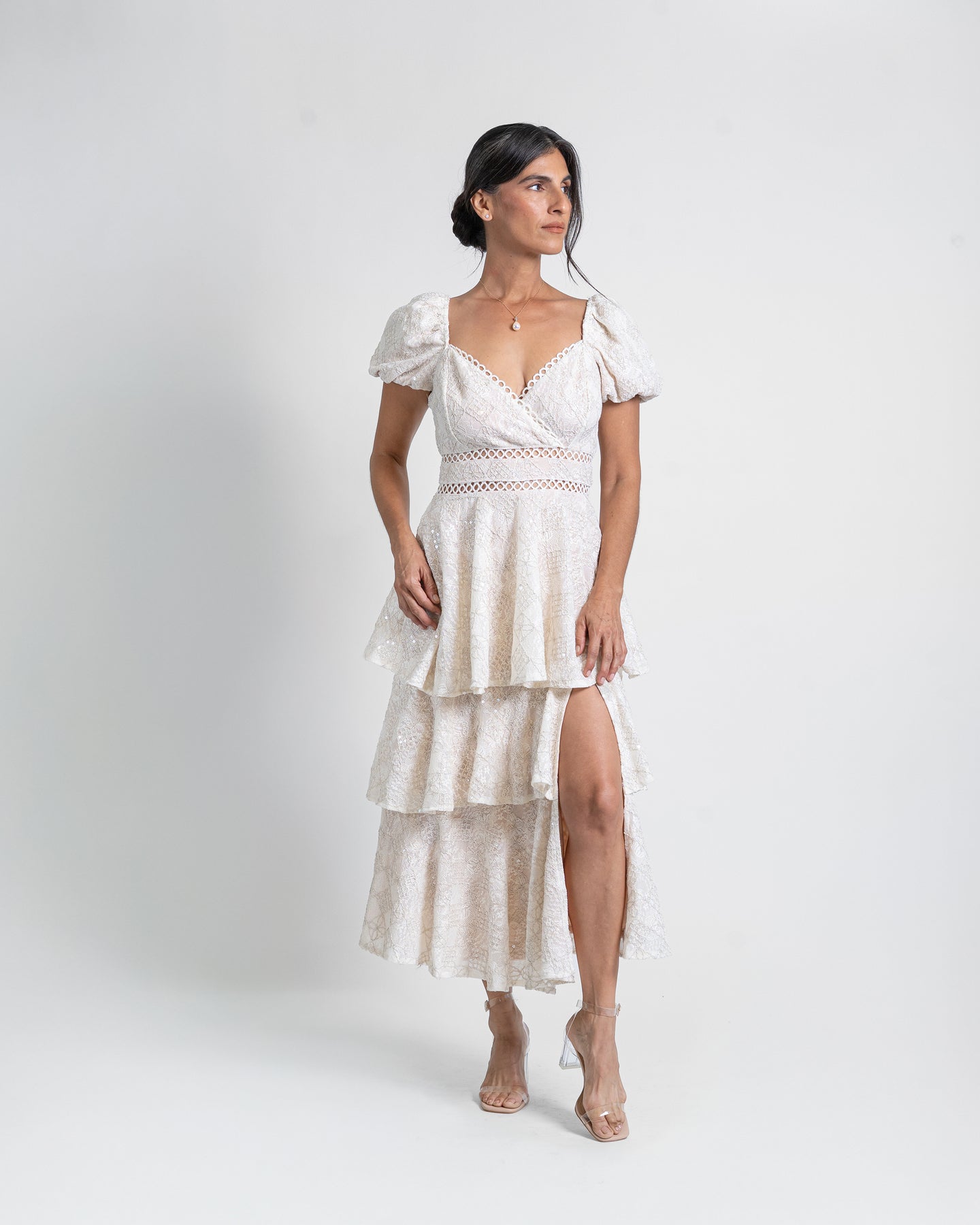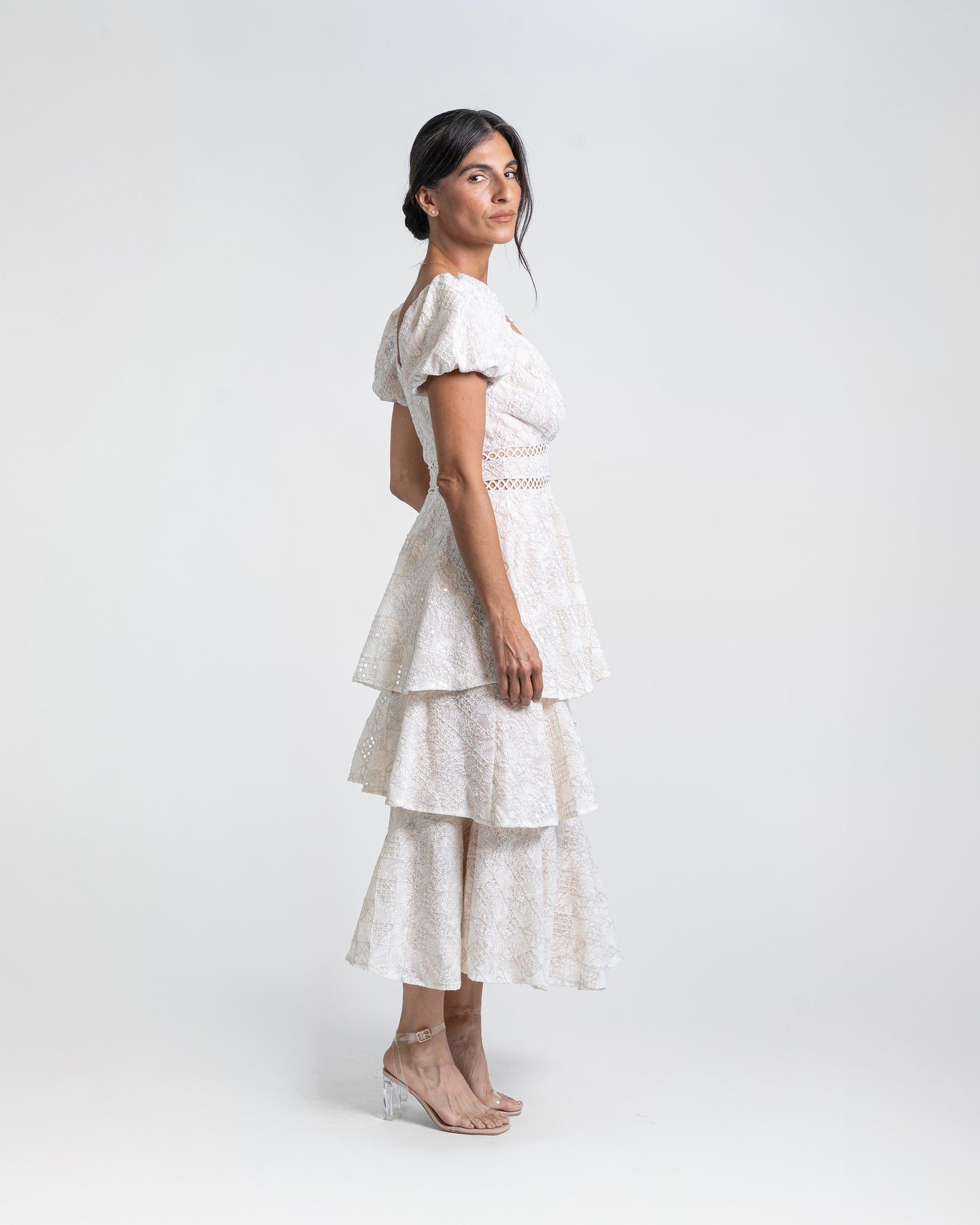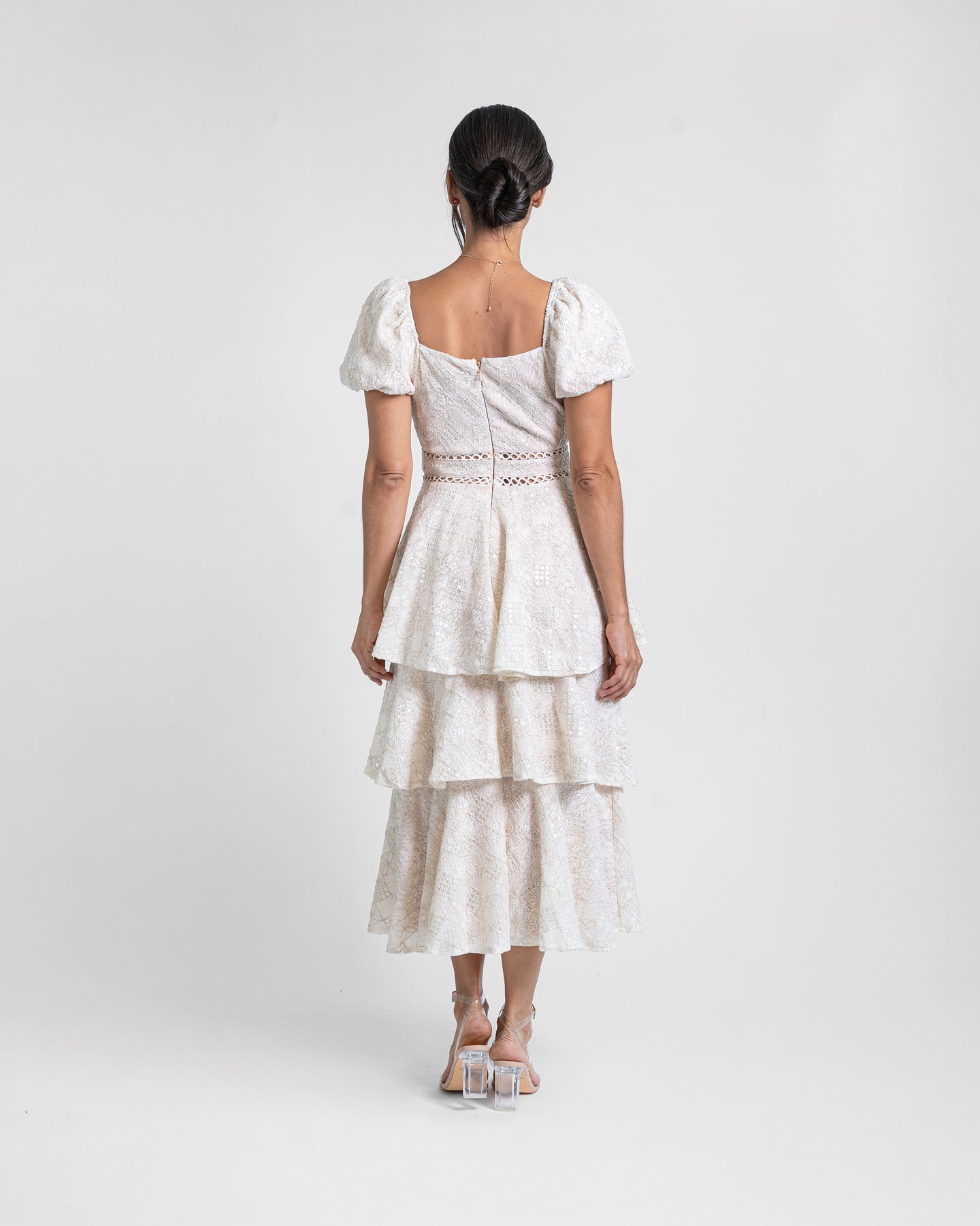 La cintura con detalles calados crea una forma favorecedora, y la falda de tres niveles aporta movimiento y sofisticación en cada paso. Es una pieza perfecta para bodas de día, eventos al aire libre, cenas especiales o celebraciones donde el estilo clásico se mezcla con un encanto moderno.