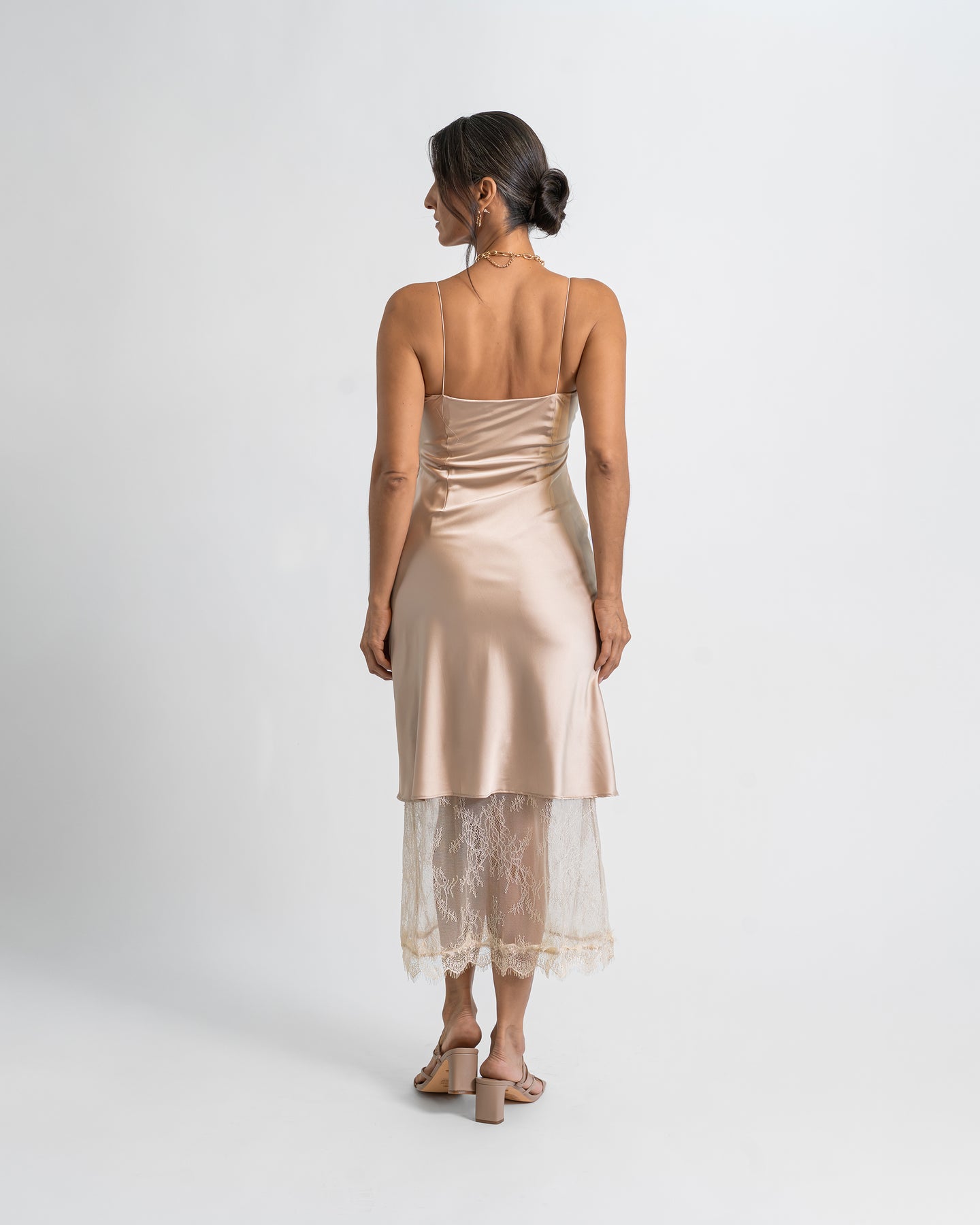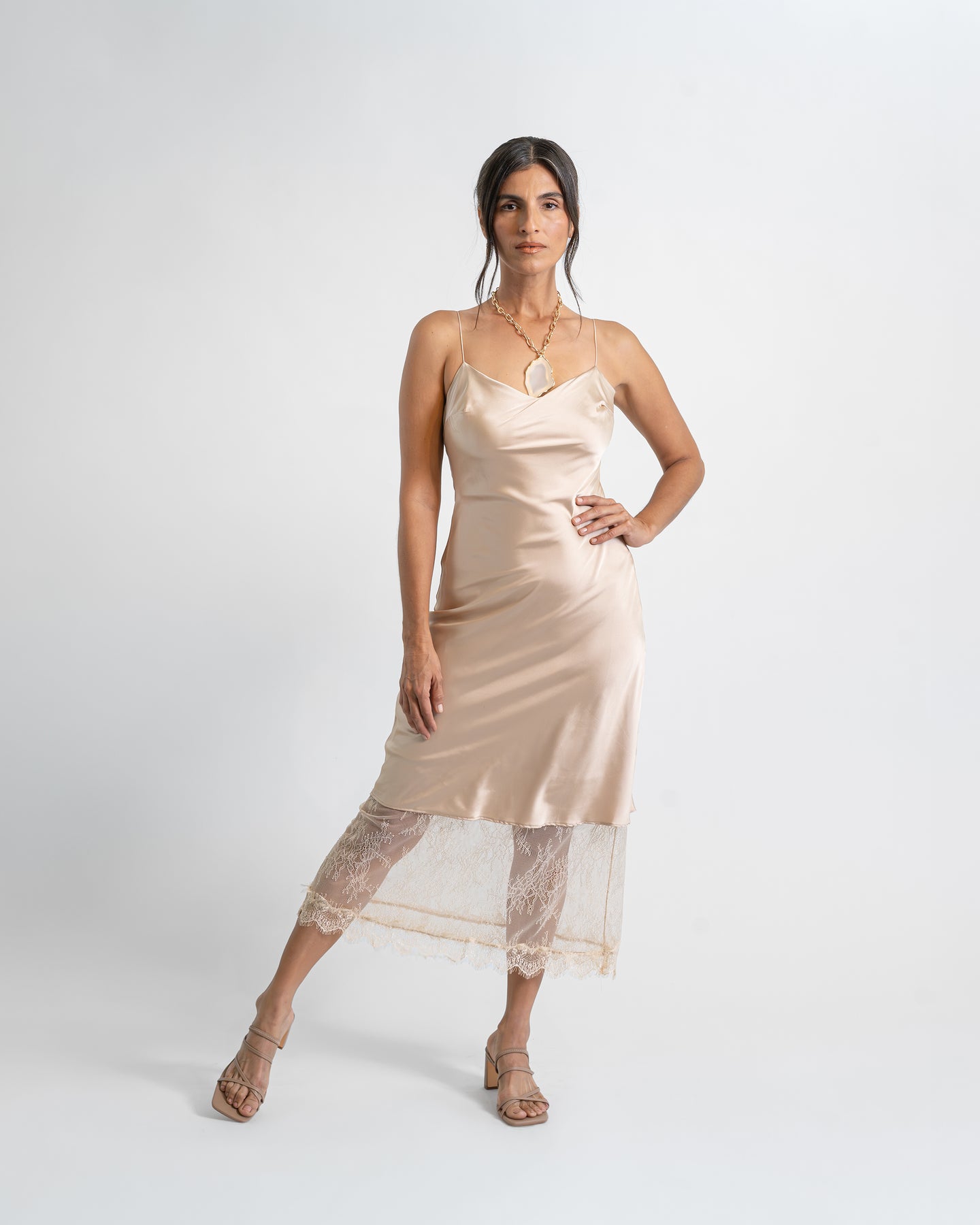 El Nude Grace combina la suavidad del satín con la delicadeza del encaje para crear un look femenino y sofisticado. Su corte limpio y los tirantes delgados estilizan la silueta, mientras que el detalle de encaje en la parte baja aporta textura, movimiento y un toque romántico.